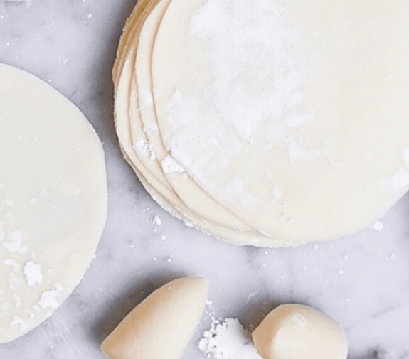 - Spolverare il piano di lavoro con pochissima fecola, con il mattarello formare dei dischi da 10 centimetri di diametro e procedere con la realizzazione dei gyoza.