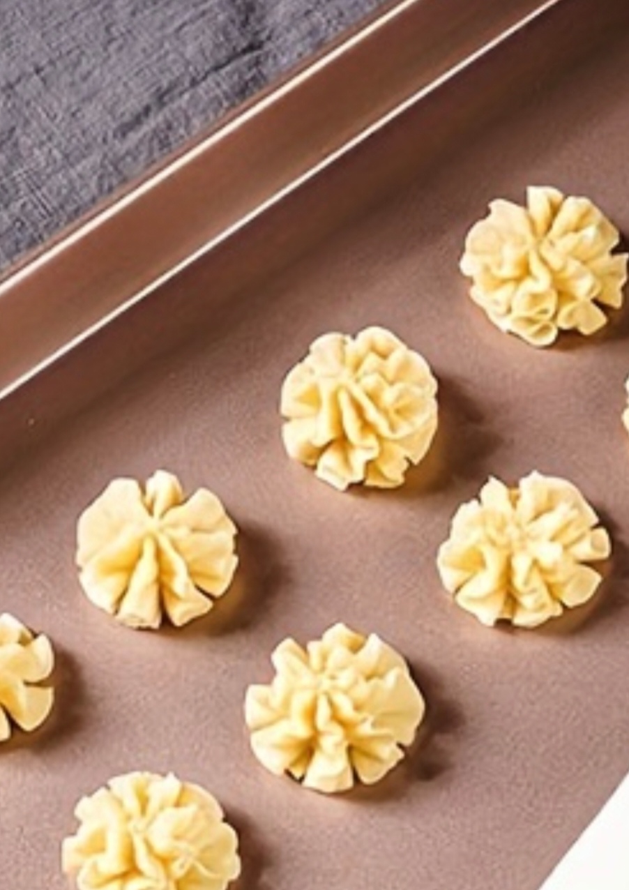 3. Trasferire la frolla nella sac à poche munita di bocchetta dentellata e dressarla nella forma desiderata su una teglia rivestita con carta forno.